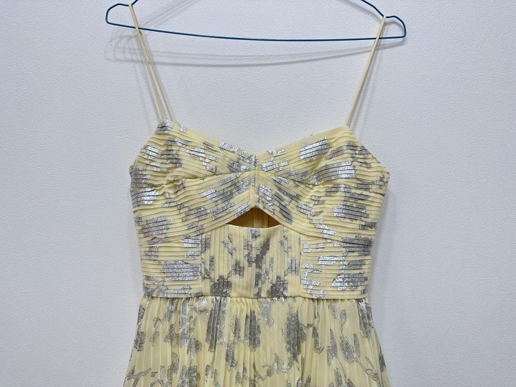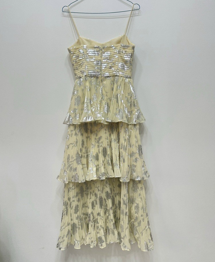 2024年春夏新品女装性感迷人黄色雪纺烫金百褶蛋糕长款吊带连衣裙