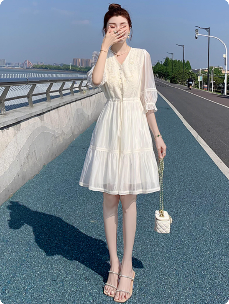 新款法式高级感V领刺绣仙女裙温柔风收腰白色连衣裙女潮